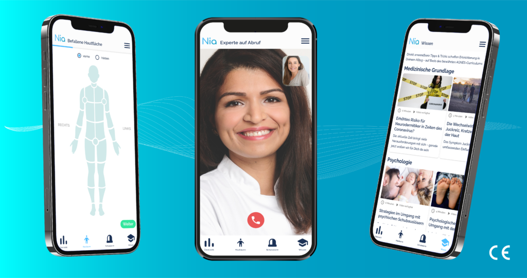 The award-winning eczema app Nia is the most used medical eczema app in Europe. Nia was the first app of its kind to be approved as a medical device. Six months after its release in 2019, it was already reimbursed by Germany’s third-largest health insurance company.